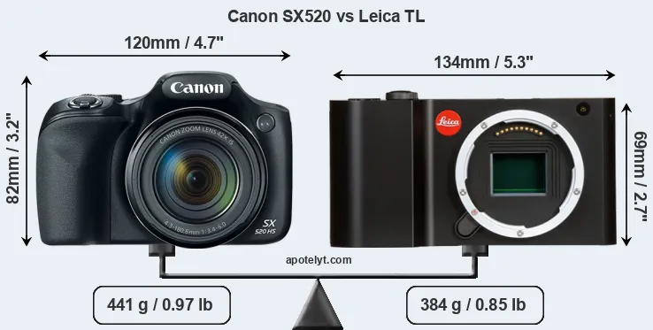 The side-by-side display below illustrates the physical size and weight of the Canon SX520 and the Leica TL. The two cameras are presented according to their relative size. Three consecutive views from the front, the top, and the rear side are shown. All width, height and depth measures are rounded to the nearest millimeter.