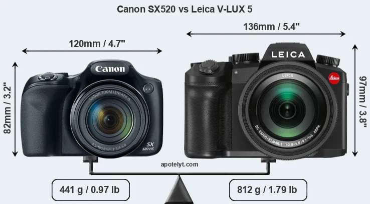 If the front view area (width x height) of the cameras is taken as an aggregate measure of their size, the Leica V-LUX 5 is notably larger (34 percent) than the Canon SX520. Moreover, the V-LUX 5 is substantially heavier (84 percent) than the SX520. In this context, it is worth noting that neither the SX520 nor the V-LUX 5 are weather-sealed.