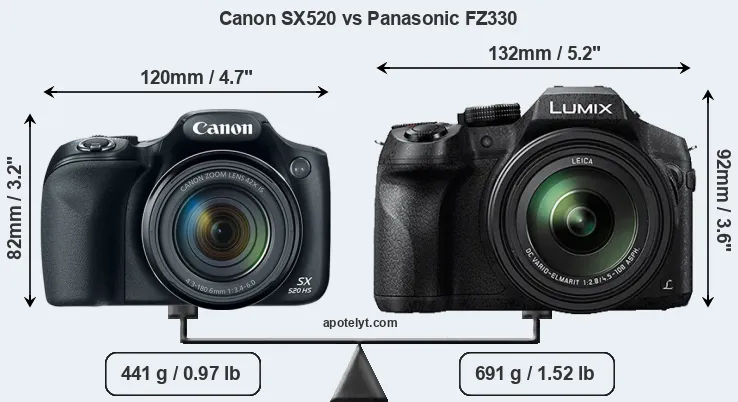If the front view area (width x height) of the cameras is taken as an aggregate measure of their size, the Panasonic FZ330 is notably larger (23 percent) than the Canon SX520. Moreover, the FZ330 is substantially heavier (57 percent) than the SX520. It is noteworthy in this context that the FZ330 is splash and dust-proof, while the SX520 does not feature any corresponding weather-sealing.