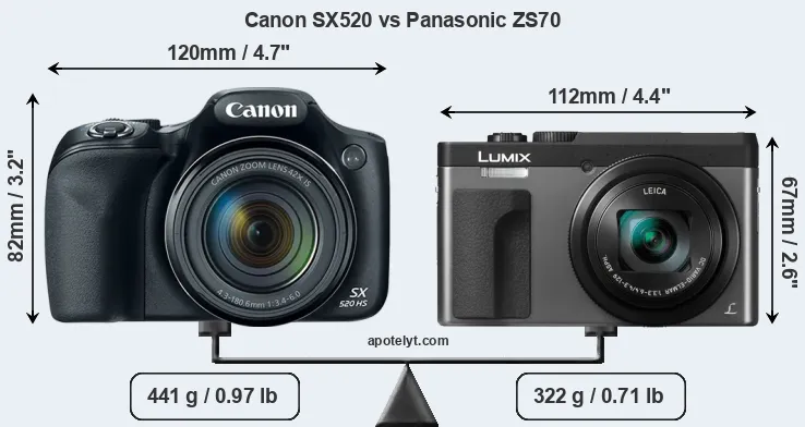 The side-by-side display below illustrates the physical size and weight of the Canon SX520 and the Panasonic ZS70. The two cameras are presented according to their relative size. Three consecutive views from the front, the top, and the rear side are shown. All width, height and depth dimensions are rounded to the nearest millimeter.