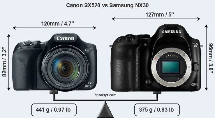 The above size and weight comparisons are to some extent incomplete and possibly misleading, as the SX520 has a lens built in, whereas the NX30 is an interchangeable lens camera that requires a separate lens. Attaching the latter will add extra weight and bulk to the setup.