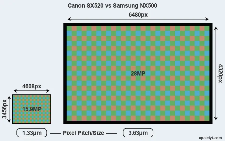 | Sensor Specs | Canon SX520 | Samsung NX500 |