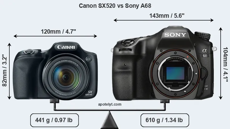 If the front view area (width x height) of the cameras is taken as an aggregate measure of their size, the Sony A68 is considerably larger (51 percent) than the Canon SX520. In this context, it is worth noting that neither the SX520 nor the A68 are weather-sealed.