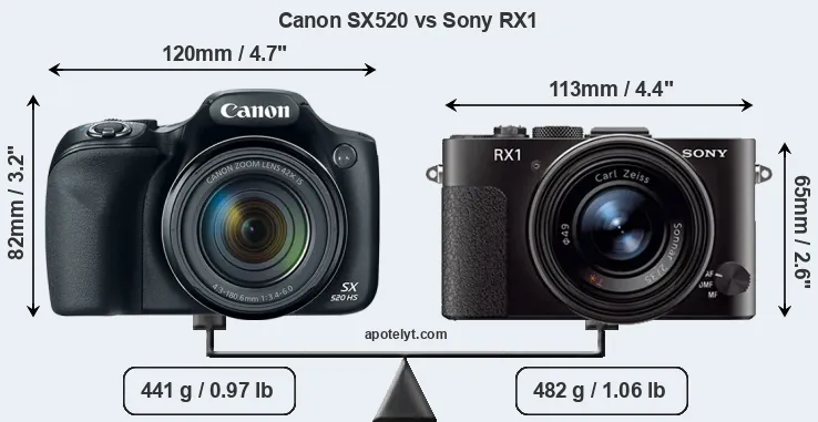 If the front view area (width x height) of the cameras is taken as an aggregate measure of their size, the Sony RX1 is notably smaller (25 percent) than the Canon SX520. However, the RX1 is markedly heavier (9 percent) than the SX520. In this context, it is worth noting that neither the SX520 nor the RX1 are weather-sealed.