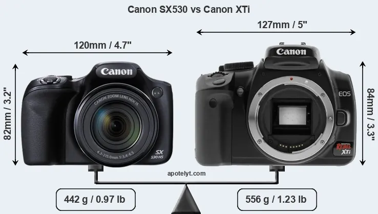 An illustration of the physical size and weight of the Canon SX530 and the Canon XTi is provided in the side-by-side display below. The two cameras are presented according to their relative size. Three consecutive perspectives from the front, the top, and the back are available. All size dimensions are rounded to the nearest millimeter.