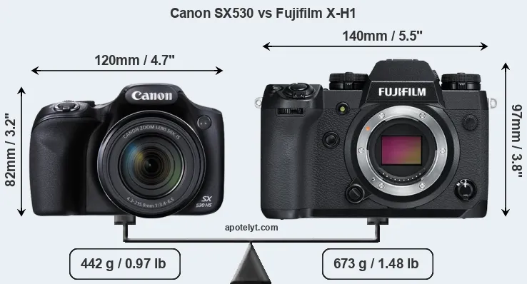 If the front view area (width x height) of the cameras is taken as an aggregate measure of their size, the Fujifilm X-H1 is notably larger (38 percent) than the Canon SX530. It is noteworthy in this context that the X-H1 is splash and dust-proof, while the SX530 does not feature any corresponding weather-sealing.