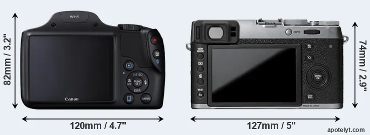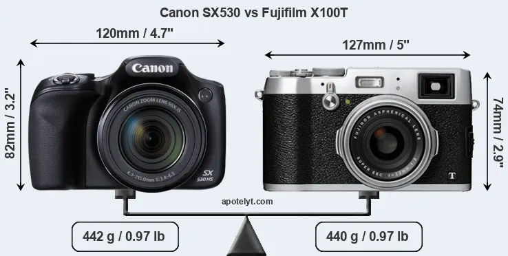 The side-by-side display below illustrates the physical size and weight of the Canon SX530 and the Fujifilm X100T. The two cameras are presented according to their relative size. Three consecutive views from the front, the top, and the rear side are shown. All width, height and depth dimensions are rounded to the nearest millimeter.
