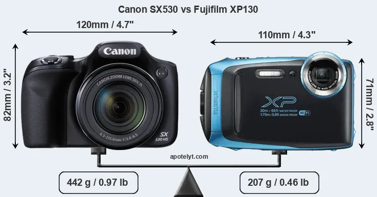 An illustration of the physical size and weight of the Canon SX530 and the Fujifilm XP130 is provided in the side-by-side display below. The two cameras are presented according to their relative size. Three consecutive perspectives from the front, the top, and the back are available. All size dimensions are rounded to the nearest millimeter.