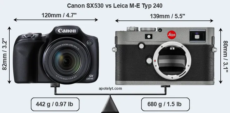 An illustration of the physical size and weight of the Canon SX530 and the Leica M-E Typ 240 is provided in the side-by-side display below. The two cameras are presented according to their relative size. Three consecutive views from the front, the top, and the rear side are shown. All size dimensions are rounded to the nearest millimeter.