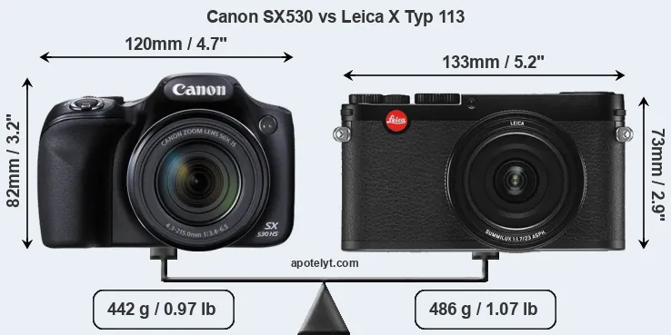 The physical size and weight of the Canon SX530 and the Leica X Typ 113 are illustrated in the side-by-side display below. The two cameras are presented according to their relative size. Three successive views from the front, the top, and the rear are shown. All width, height and depth dimensions are rounded to the nearest millimeter.