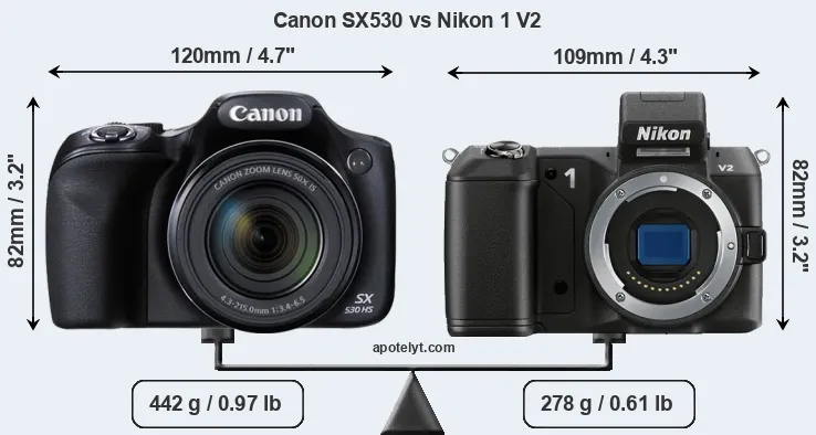 The side-by-side display below illustrates the physical size and weight of the Canon SX530 and the Nikon 1 V2. The two cameras are presented according to their relative size. Three successive views from the front, the top, and the rear are shown. All size dimensions are rounded to the nearest millimeter.