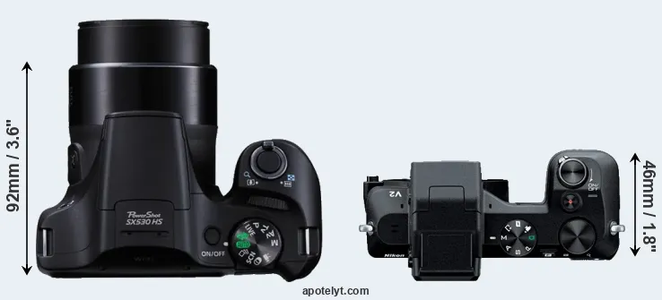 The above size and weight comparisons are to some extent incomplete and possibly misleading, as the SX530 has a lens built in, whereas the V2 is an interchangeable lens camera that requires a separate lens. Attaching the latter will add extra weight and bulk to the setup.