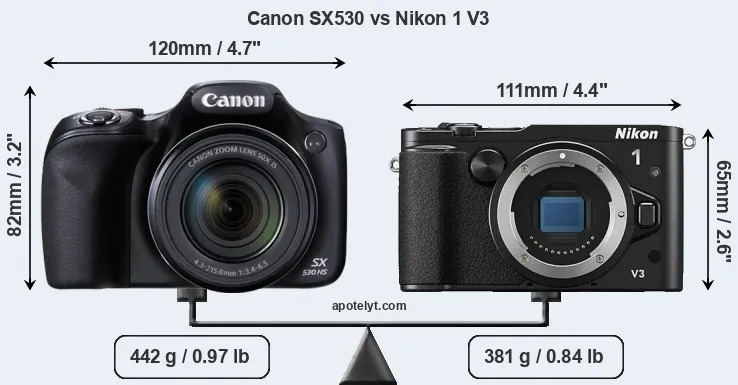 The physical size and weight of the Canon SX530 and the Nikon 1 V3 are illustrated in the side-by-side display below. The two cameras are presented according to their relative size. Three consecutive views from the front, the top, and the rear side are shown. All size dimensions are rounded to the nearest millimeter.