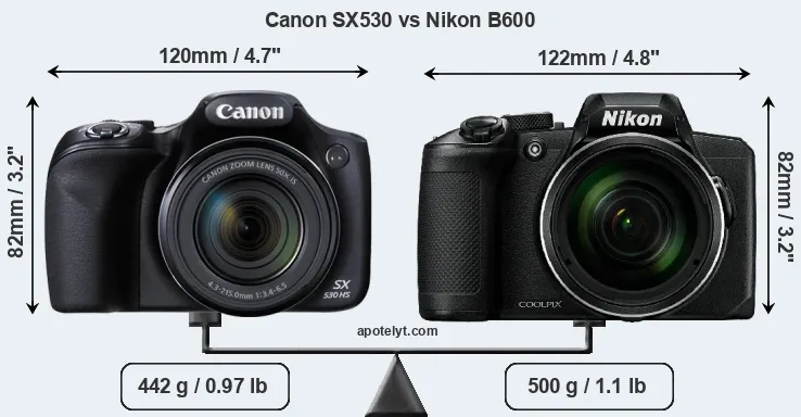 An illustration of the physical size and weight of the Canon SX530 and the Nikon B600 is provided in the side-by-side display below. The two cameras are presented according to their relative size. Three consecutive perspectives from the front, the top, and the back are available. All size dimensions are rounded to the nearest millimeter.