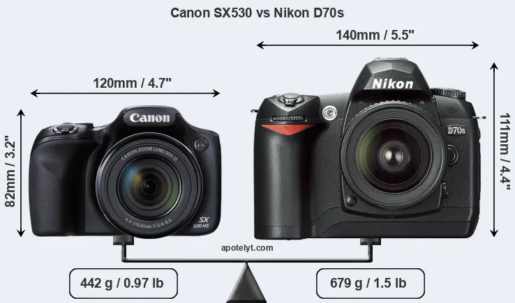 If the front view area (width x height) of the cameras is taken as an aggregate measure of their size, the Nikon D70s is considerably larger (58 percent) than the Canon SX530. In this context, it is worth noting that neither the SX530 nor the D70s are weather-sealed.