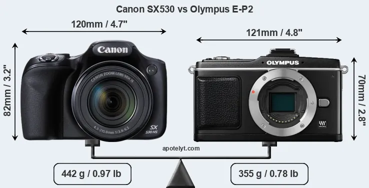An illustration of the physical size and weight of the Canon SX530 and the Olympus E-P2 is provided in the side-by-side display below. The two cameras are presented according to their relative size. Three consecutive perspectives from the front, the top, and the back are available. All width, height and depth dimensions are rounded to the nearest millimeter.