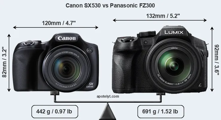 If the front view area (width x height) of the cameras is taken as an aggregate measure of their size, the Panasonic FZ300 is notably larger (23 percent) than the Canon SX530. Moreover, the FZ300 is substantially heavier (56 percent) than the SX530. It is noteworthy in this context that the FZ300 is splash and dust-proof, while the SX530 does not feature any corresponding weather-sealing.