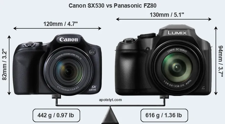 An illustration of the physical size and weight of the Canon SX530 and the Panasonic FZ80 is provided in the side-by-side display below. The two cameras are presented according to their relative size. Three consecutive perspectives from the front, the top, and the back are available. All size dimensions are rounded to the nearest millimeter.