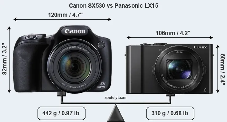 An illustration of the physical size and weight of the Canon SX530 and the Panasonic LX15 is provided in the side-by-side display below. The two cameras are presented according to their relative size. Three successive views from the front, the top, and the rear are shown. All width, height and depth measures are rounded to the nearest millimeter.
