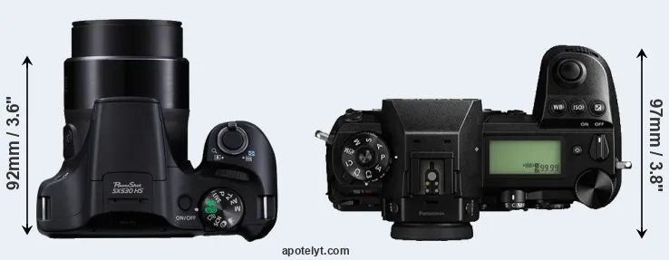 The side-by-side display below illustrates the physical size and weight of the Canon SX530 and the Panasonic S1R. The two cameras are presented according to their relative size. Three consecutive views from the front, the top, and the rear side are shown. All width, height and depth dimensions are rounded to the nearest millimeter.