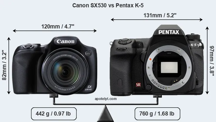 The above size and weight comparisons are to some extent incomplete and possibly misleading, as the SX530 has a lens built in, whereas the K-5 is an interchangeable lens camera that requires a separate lens. Attaching the latter will add extra weight and bulk to the setup.
