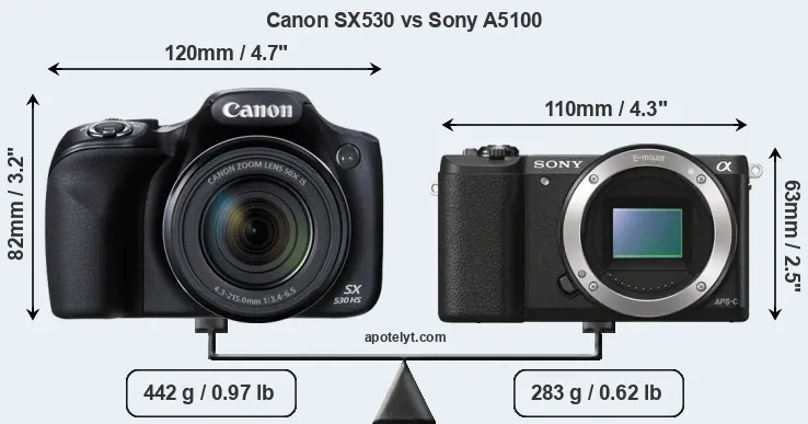 An illustration of the physical size and weight of the Canon SX530 and the Sony A5100 is provided in the side-by-side display below. The two cameras are presented according to their relative size. Three successive views from the front, the top, and the rear are shown. All width, height and depth dimensions are rounded to the nearest millimeter.