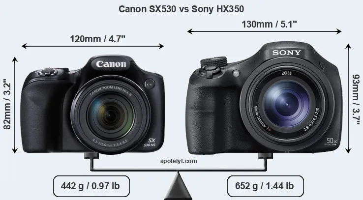 The side-by-side display below illustrates the physical size and weight of the Canon SX530 and the Sony HX350. The two cameras are presented according to their relative size. Three successive views from the front, the top, and the rear are shown. All size dimensions are rounded to the nearest millimeter.