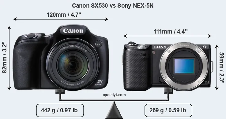 An illustration of the physical size and weight of the Canon SX530 and the Sony NEX-5N is provided in the side-by-side display below. The two cameras are presented according to their relative size. Three consecutive perspectives from the front, the top, and the back are available. All size dimensions are rounded to the nearest millimeter.