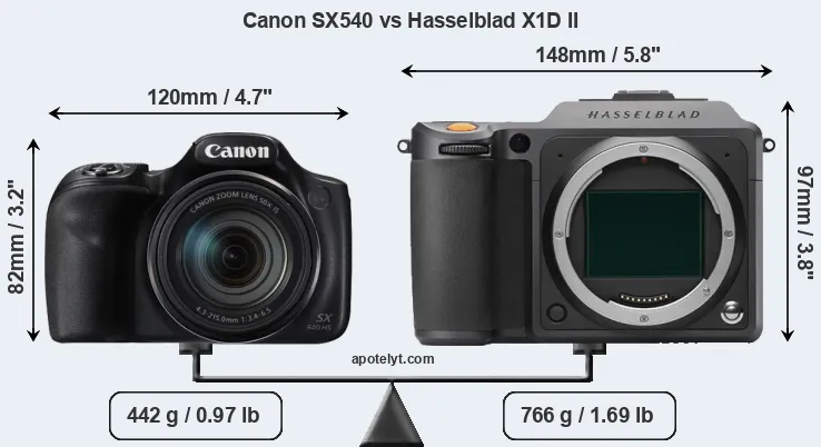 If the front view area (width x height) of the cameras is taken as an aggregate measure of their size, the Hasselblad X1D II is considerably larger (46 percent) than the Canon SX540. It is noteworthy in this context that the X1D II is splash and dust-proof, while the SX540 does not feature any corresponding weather-sealing.
