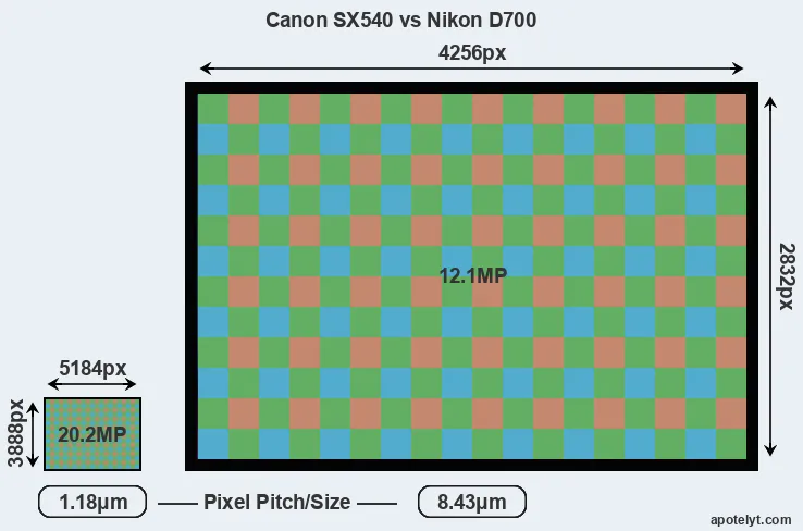 Despite having a smaller sensor, the Canon SX540 offers a higher resolution of 20.2 megapixels, compared with 12.1 MP of the Nikon D700. This megapixels advantage comes at the cost of a higher pixel density and a smaller size of the individual pixel (with a pixel pitch of 1.18μm versus 8.43μm for the D700). However, it should be noted that the SX540 is much more recent (by 7 years and 6 months) than the D700, and its sensor will have benefitted from technological advances during this time that make it possible to gather light more efficiently. Coming back to sensor resolution, it should be mentioned that the SX540 has no anti-alias filter installed, so that it can capture all the detail its sensor resolves.