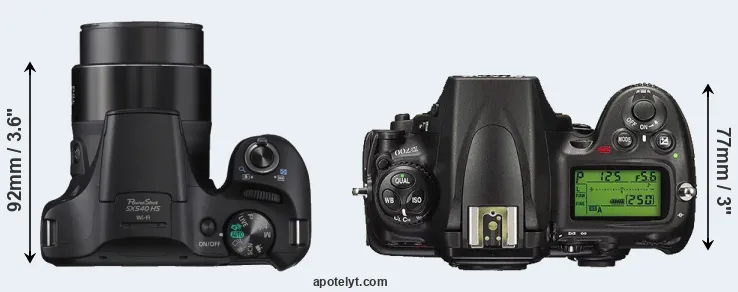 The side-by-side display below illustrates the physical size and weight of the Canon SX540 and the Nikon D700. The two cameras are presented according to their relative size. Three successive views from the front, the top, and the rear are shown. All size dimensions are rounded to the nearest millimeter.
