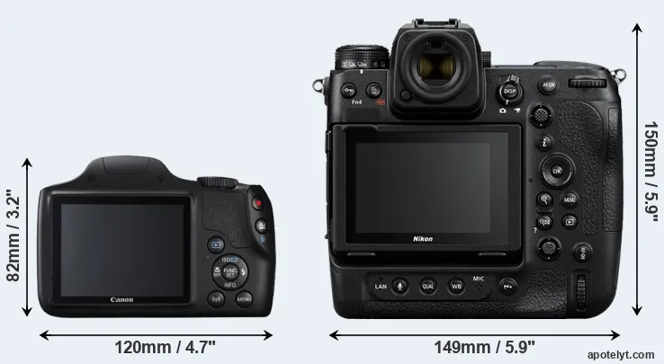 The physical size and weight of the Canon SX540 and the Nikon Z9 are illustrated in the side-by-side display below. The two cameras are presented according to their relative size. Three consecutive perspectives from the front, the top, and the back are available. All width, height and depth measures are rounded to the nearest millimeter.