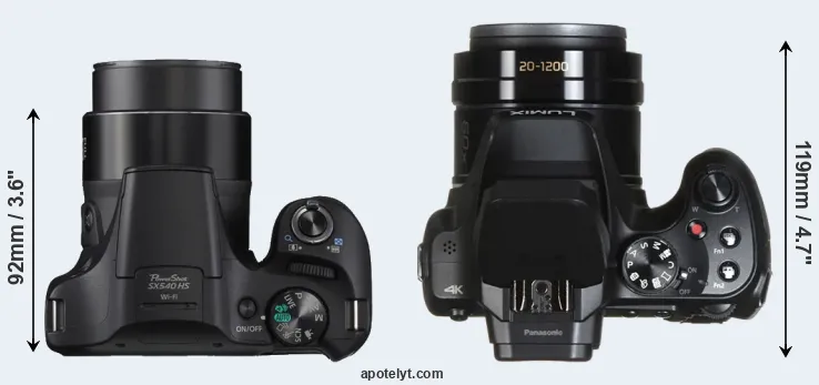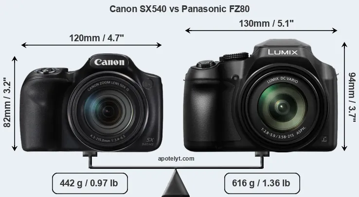 The side-by-side display below illustrates the physical size and weight of the Canon SX540 and the Panasonic FZ80. The two cameras are presented according to their relative size. Three consecutive views from the front, the top, and the rear side are shown. All width, height and depth dimensions are rounded to the nearest millimeter.