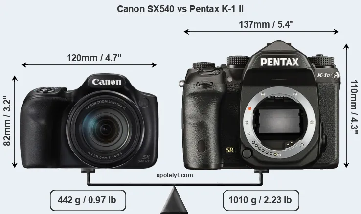 If the front view area (width x height) of the cameras is taken as an aggregate measure of their size, the Pentax K-1 II is considerably larger (53 percent) than the Canon SX540. It is noteworthy in this context that the K-1 II is splash and dust-proof, while the SX540 does not feature any corresponding weather-sealing.