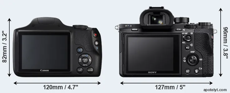 The physical size and weight of the Canon SX540 and the Sony A7S II are illustrated in the side-by-side display below. The two cameras are presented according to their relative size. Three consecutive views from the front, the top, and the rear side are shown. All size dimensions are rounded to the nearest millimeter.