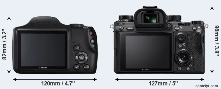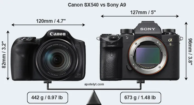 The physical size and weight of the Canon SX540 and the Sony A9 are illustrated in the side-by-side display below. The two cameras are presented according to their relative size. Three consecutive views from the front, the top, and the rear side are shown. All width, height and depth dimensions are rounded to the nearest millimeter.