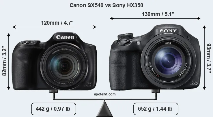 The physical size and weight of the Canon SX540 and the Sony HX350 are illustrated in the side-by-side display below. The two cameras are presented according to their relative size. Three consecutive perspectives from the front, the top, and the back are available. All width, height and depth dimensions are rounded to the nearest millimeter.