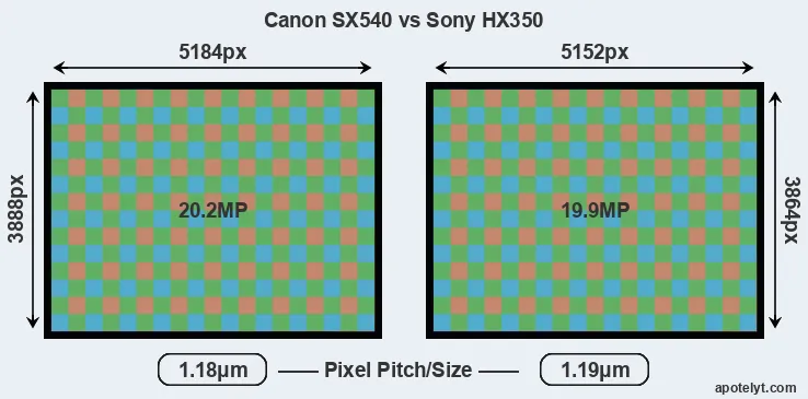 While the two cameras under review share the same sensor size, the SX540 offers a slightly higher resolution of 20.2 megapixels, compared with 19.9 MP of the HX350. This megapixels advantage translates into a 0.59999999999999 percent gain in linear resolution. On the other hand, these sensor specs imply that the SX540 has a higher pixel density and a smaller size of the individual pixel (with a pixel pitch of 1.18μm versus 1.19μm for the HX350). Moreover, it should be noted that the HX350 is a somewhat more recent model (by 11 months) than the SX540, and its sensor might have benefitted from technological advances during this time that further enhance the light gathering capacity of individual pixels. Coming back to sensor resolution, it should be mentioned that neither of the two cameras has an anti-alias filter installed, so they are able to capture all the detail the sensor resolves.