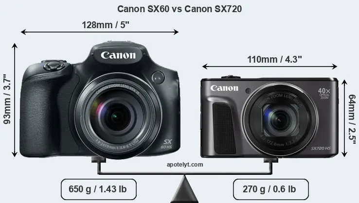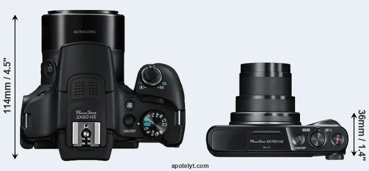 The physical size and weight of the Canon SX60 and the Canon SX720 are illustrated in the side-by-side display below. The two cameras are presented according to their relative size. Three successive views from the front, the top, and the rear are shown. All width, height and depth measures are rounded to the nearest millimeter.
