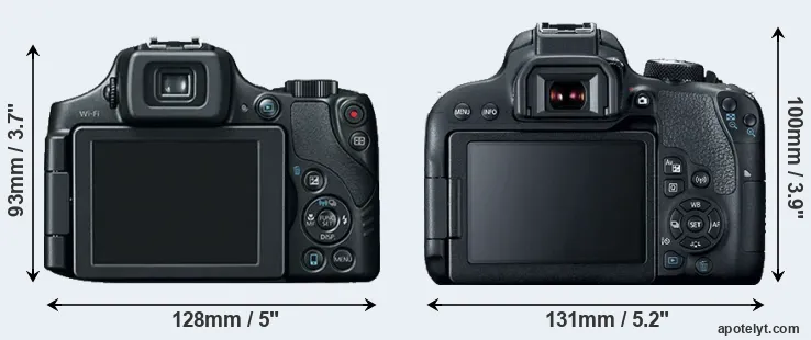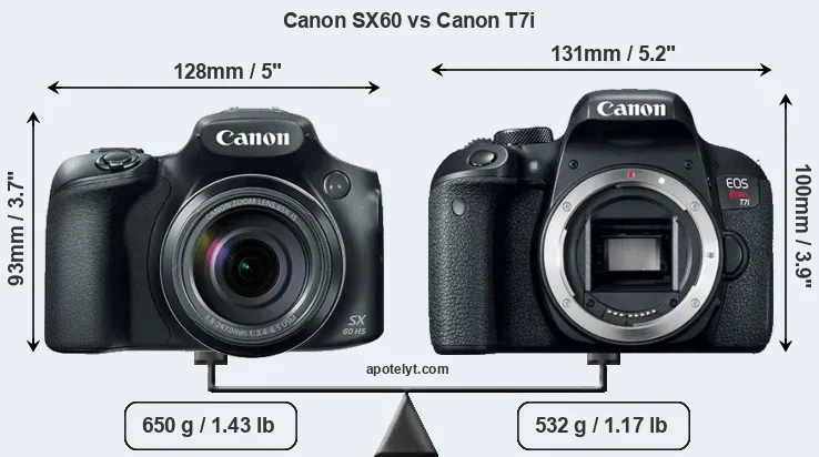 An illustration of the physical size and weight of the Canon SX60 and the Canon T7i is provided in the side-by-side display below. The two cameras are presented according to their relative size. Three successive views from the front, the top, and the rear are shown. All size dimensions are rounded to the nearest millimeter.