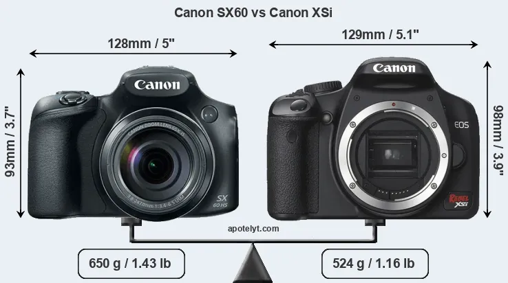 The physical size and weight of the Canon SX60 and the Canon XSi are illustrated in the side-by-side display below. The two cameras are presented according to their relative size. Three consecutive views from the front, the top, and the rear side are shown. All size dimensions are rounded to the nearest millimeter.