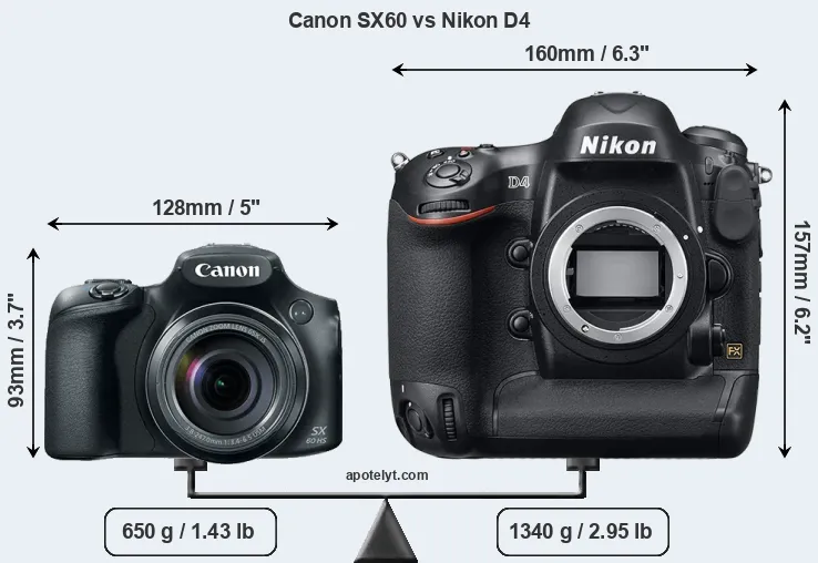 The physical size and weight of the Canon SX60 and the Nikon D4 are illustrated in the side-by-side display below. The two cameras are presented according to their relative size. Three consecutive views from the front, the top, and the rear side are shown. All width, height and depth dimensions are rounded to the nearest millimeter.