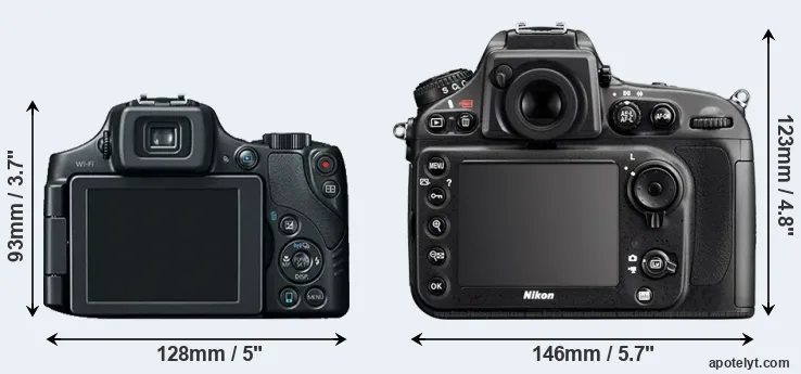 The physical size and weight of the Canon SX60 and the Nikon D800 are illustrated in the side-by-side display below. The two cameras are presented according to their relative size. Three consecutive perspectives from the front, the top, and the back are available. All width, height and depth dimensions are rounded to the nearest millimeter.