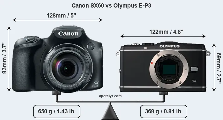 The physical size and weight of the Canon SX60 and the Olympus E-P3 are illustrated in the side-by-side display below. The two cameras are presented according to their relative size. Three consecutive views from the front, the top, and the rear side are shown. All size dimensions are rounded to the nearest millimeter.