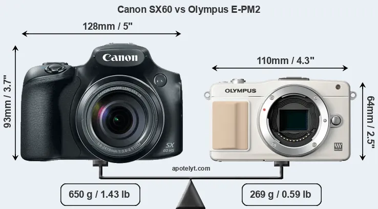 An illustration of the physical size and weight of the Canon SX60 and the Olympus E-PM2 is provided in the side-by-side display below. The two cameras are presented according to their relative size. Three successive views from the front, the top, and the rear are shown. All width, height and depth measures are rounded to the nearest millimeter.
