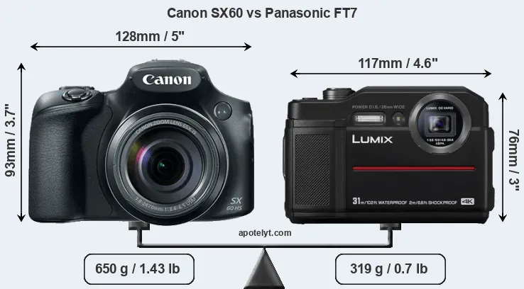 The side-by-side display below illustrates the physical size and weight of the Canon SX60 and the Panasonic FT7. The two cameras are presented according to their relative size. Three consecutive perspectives from the front, the top, and the back are available. All width, height and depth dimensions are rounded to the nearest millimeter.