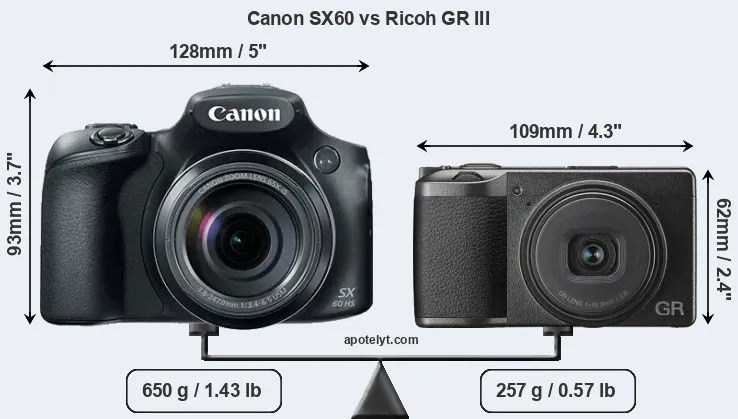 If the front view area (width x height) of the cameras is taken as an aggregate measure of their size, the Ricoh GR III is considerably smaller (43 percent) than the Canon SX60. Moreover, the GR III is substantially lighter (60 percent) than the SX60. In this context, it is worth noting that neither the SX60 nor the GR III are weather-sealed.