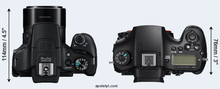 The physical size and weight of the Canon SX60 and the Sony A99 II are illustrated in the side-by-side display below. The two cameras are presented according to their relative size. Three consecutive perspectives from the front, the top, and the back are available. All size dimensions are rounded to the nearest millimeter.