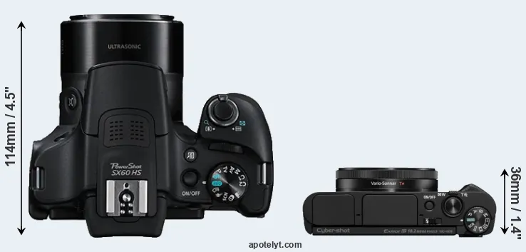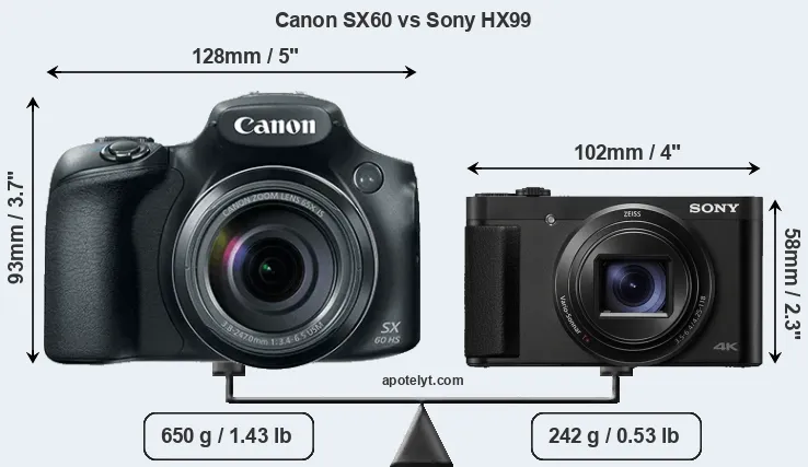 The side-by-side display below illustrates the physical size and weight of the Canon SX60 and the Sony HX99. The two cameras are presented according to their relative size. Three consecutive perspectives from the front, the top, and the back are available. All width, height and depth measures are rounded to the nearest millimeter.