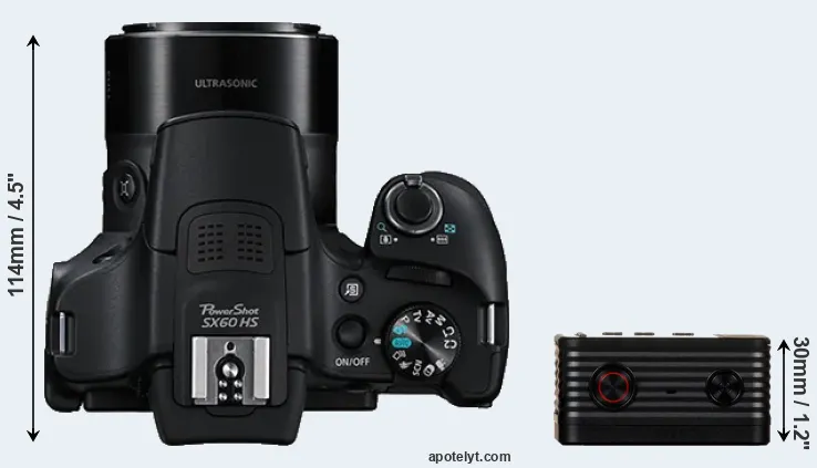 The side-by-side display below illustrates the physical size and weight of the Canon SX60 and the Sony RX0. The two cameras are presented according to their relative size. Three successive views from the front, the top, and the rear are shown. All size dimensions are rounded to the nearest millimeter.